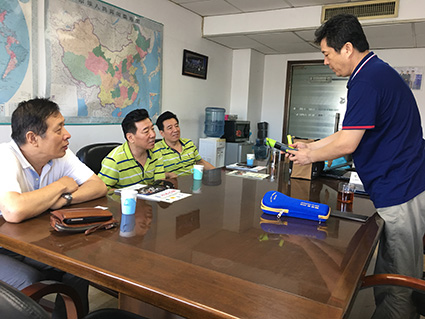 向刘全和、刘全利介绍预灾用品的研发及捐赠情况