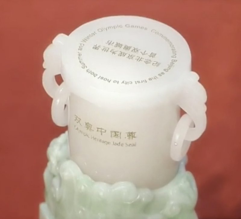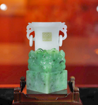 据悉,《双奥·中国尊》采用和田玉制作,以中国传统礼器“尊”为造型,上下分体,有白有绿,绿色代表夏奥,白色代表冬天的冰雪,整体设计紧紧围绕双奥主题,巧妙地将冬奥和夏奥连接在一起,将中国传统文化与现代奥林匹克文化紧密融合,更好地传播奥林匹克文化,弘扬奥林匹克精神。《双奥·中国尊》总高9.6厘米,顶部宽5.6厘米,分别代表了960万平方公里的国土面积和56个民族;底宽4.4厘米,加上尊的高度9.6厘米正好是14厘米,代表14亿中国人,寓意全中国人民对双奥的向往和对奥林匹克文化的认同。在设计上采用切割、打磨、抛光等工序,运用透雕、圆雕、浮雕等雕刻技法,历时一年制作完成。