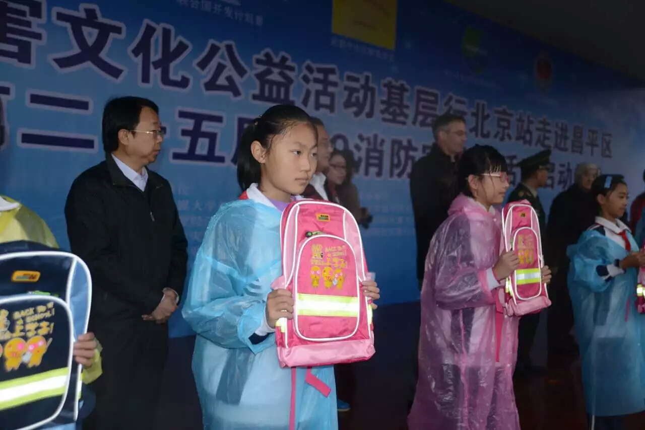 与会领导还分别为百善小学750名小学生代表和170名教职工代表发放预灾安全书包和预灾公文包、论文集,昌平区人民政府副区长贺军宣布“国家预防灾害文化公益活动基层行北京站走进昌平区暨昌平区第二十五届119消防宣传月活动正式启动”。