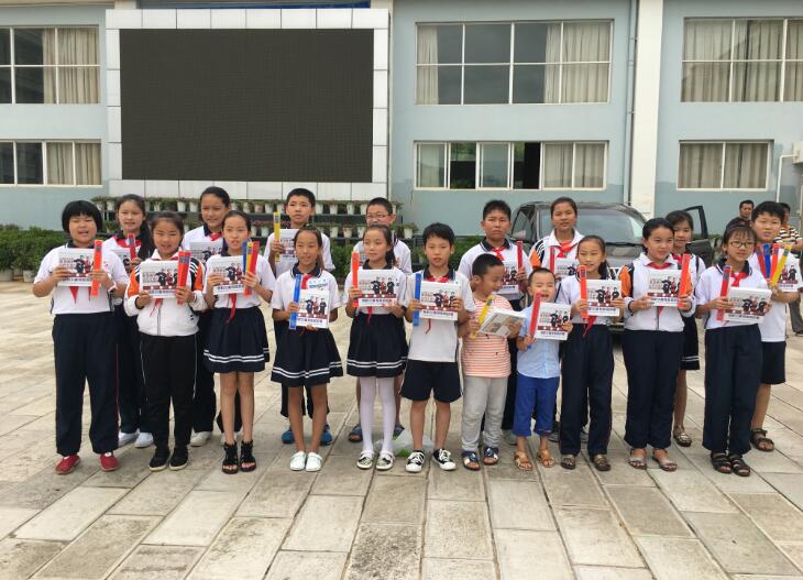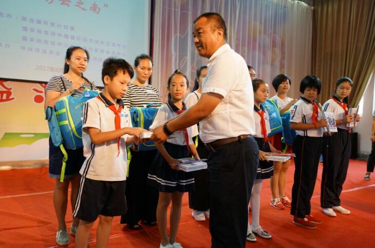 (向学生们捐赠的预灾四色笔和预灾教育荧光格尺手环) 联合国开发计划署驻华代表处灾害管理处项目经理张素娟代表国家预防灾害文化建设公益项目管理办公室向开远市五名志愿者颁发了志愿者聘书。