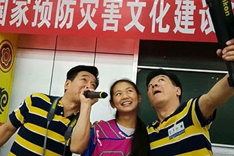 预灾知识问答 著名幽默喜剧表演艺术家、预灾联盟志愿者刘全和、刘全利用诙谐生动的表演形式与学习预灾知识、熟练掌握预灾用品的使用方法相结合与广大师生和贫困建卡户互动交流,迎来了阵阵掌声,并和校职工一起把预灾包安放的位置和装置的方式进行了示范安装。