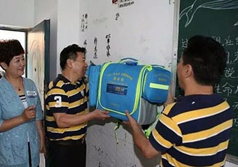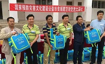 教室预灾包安装示范 出资捐赠含有防烟口罩2920个、防割手套146副、水基灭火器146个、多功能预灾手电73支、医疗预灾包73个、灭火毯73包在内的学校预灾包73套,捐赠小学生预灾书包380个,预灾宣传四色笔975盒,预灾照明瓶619个,《急救手册》619本。共有1400余名师生、600余户扶贫建卡户参加了活动,起到了应有的效果。